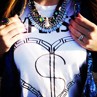 Like some of you may have done, I bought some special clothes to wear around the holidays, and one of those pieces happen to be a sparkly thing of a sequin baseball bomber jacket in bright blue. Sequins I think are the overlooked asset to a great outfit, whether that's a dressed up or down one. Once I saw this jacket I knew it was special, special because I saw me having many ways to be worn and having many partners to go with in my closet, not just a one hit wonder. I know what your thinking, sequins? Sequins are not just a holiday or special occasion date, it's something that can liven up that casual outfit and make you shine and smile. I decided to do just that here. I paired this sequin jacket with a cut off tshirt reading "Expensive Love" (some would say "oh how fitting"), drop crotch pants, which I think are better alternatives to sweat pants but can still give you that comfy lounge feeling, leopard kicks, because leopard goes with just about anything, and this new Cccichy clutch I got myself for Christmas, she's kind of a flirt. What would have been a rather boring outfit, is gleaming in the sun for a cool and chic weekend look, so take out those "fancy" sparkles and pair them with some of your casual pieces for that second time around and be the talk of the town.